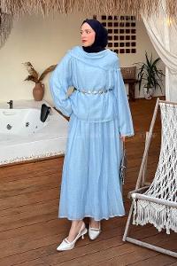 Lamelif Tensel Etek-Bluz Tesettür Takım Bebe Mavisi
