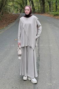 Lamelif Düğme Detaylı İkili Tesettür Takım Bej