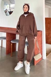 Lamelif Paça Lastikli Üç İplik Sweat Takım Acı Kahve