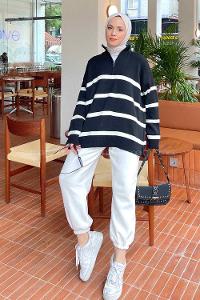 Lamelif Sebastian Fermuarlı Çizgili Kazak Siyah