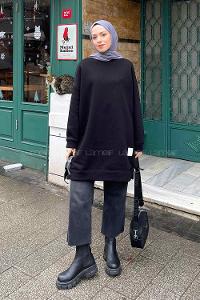 Lamelif Bisiklet Yaka Arma Detaylı Üç İplik Tunik Siyah