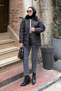 Lamelif Kürk Yaka Şişme Mont Siyah