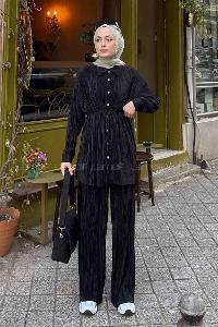 Lamelif Fitilli Pliseli İkili Tesettür Takım Siyah