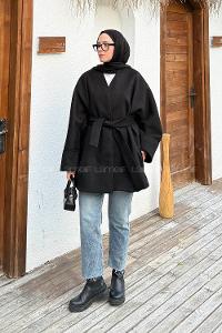 Lamelif Bağlama Detaylı Kaşe Kaban Siyah