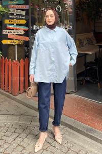 Lamelif Tek Cep Detaylı Oversize Gömlek Mavi