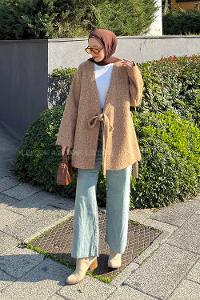 Lamelif Sakal Kumaş Atkılı Kaban Sütlü Kahve