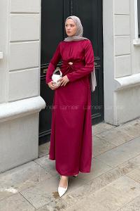 Lamelif Büzgü Detaylı Broşlu Saten Tesettür Elbise Bordo