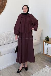 Lamelif Büzgü Detaylı Etekli Tesettür Takım Bordo