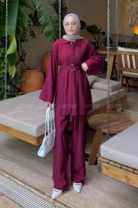 Lamelif Taş Düğme Detaylı Kemerli Takım Bordo