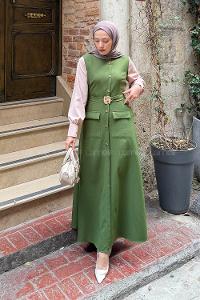 Lamelif Taş Detaylı Tesettür Elbise Haki