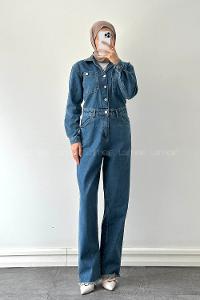 Lamelif Uzun Kollu Kot Tulum Kesik Paça