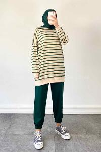 Lamelif Daisy Bisikilet Yaka Çizgili Tesettür Takım Zümrüt