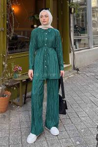 Lamelif Fitilli Pliseli İkili Tesettür Takım Zümrüt