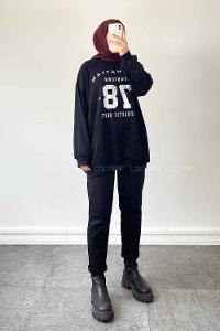 Black Hood Neck Balloon Sleeve Arm Printed Sweatshirt