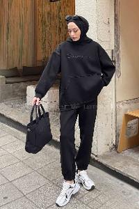 Black Hood Neck Long Arm Without Accessories Two Threads Regular Trousers Comfortable Suit