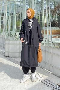 Black Long Arm Belted Buttoned Cotton Viscose Fabric Trench Coat
