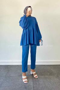 Blue Medium Crew Neck Balloon Sleeve Arm Cotton Cotton Fabric Regular Trousers Comfortable Suit
