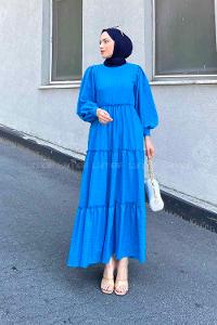 Blue Medium Crew Neck Cotton Fabric Unprinted Dresess
