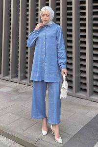 Blue Shirt Collar Long Arm Buttoned Viscose Fabric Trousers Comfortable Suit