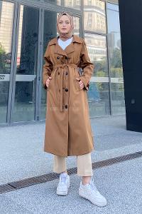 Camel Long Arm Belted Poplin Fabric Trench Coat
