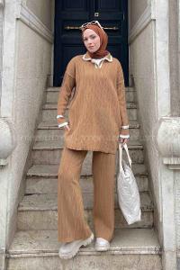 Bitter Brown Crew Neck Long Arm Without Accessories Knitwear Regular Trousers Comfortable Suit