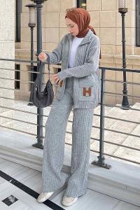 Gray Choker Neck Long Arm Without Accessories Knitwear Regular Trousers Comfortable Suit