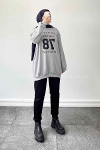 Gray Hood Neck Balloon Sleeve Arm Printed Sweatshirt