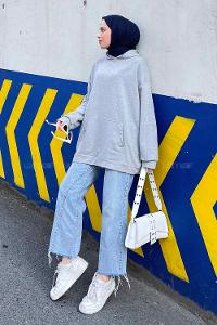 Gray Hood Neck Long Arm Unprinted Sweatshirt
