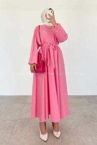 Candy Pink Medium Crew Neck Linen Unprinted Dresess