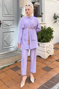 Lilac Shirt Collar Long Arm Belted Linen Regular Trousers Linen Suit