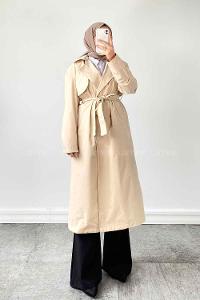 Sand Beige Long Arm Belted Poplin Fabric Trench Coat