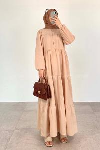 Sand Beige Mandarin Collar Cotton Unprinted Dresess