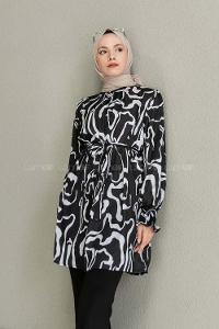 Black Mandarin Collar Viscose Fabric Printed Tunic