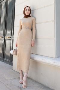 Beige Mock Turtle Neck Knitwear Unprinted Dresess