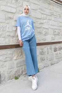 Light Blue Crew Neck Short Arm Cotton Printed T-shirt