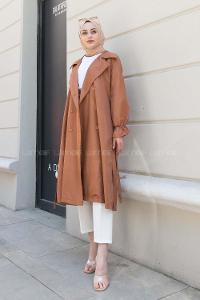Tan Long Arm Belted Buttoned Viscose Fabric Trench Coat