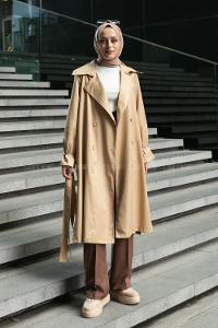 Sand Beige Long Arm Belted Poplin Fabric Trench Coat
