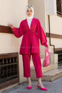 Fuchsia Scarf Neck Balloon Sleeve Arm Belted Cotton Regular Trousers Comfortable Suit