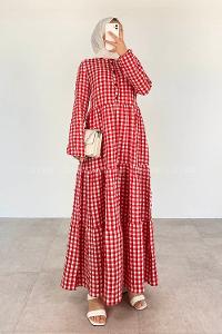 Red Mandarin Collar Cotton Viscose Fabric Printed Dresess