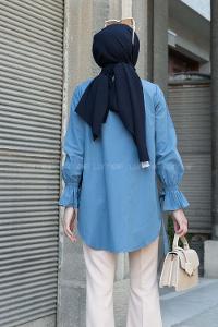 Navy Blue Shirt Collar Long Arm Linen Shirt