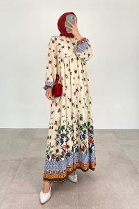 Ecru Navy Blue Foulard Neck Viscose Fabric Printed Dresess