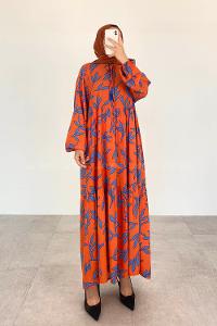 Orange Loose Crew Neck Viscose Fabric Printed Dresess