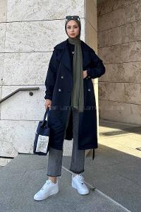 Navy Blue Long Arm Belted Cotton Trench Coat