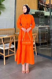 Orange Medium Crew Neck Cotton Fabric Unprinted Dresess