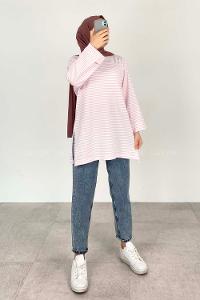 Powder Pink Crew Neck Long Arm Cotton Unprinted T-shirt