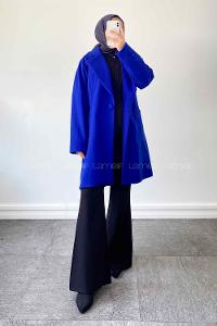 Navy Blue Jacket Collar Long Arm Stamp Fabric Coat