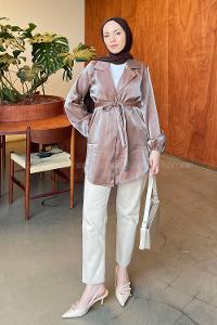 Soft Brown Scarf Neck Long Arm Viscose Fabric Jacket