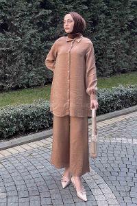 Soft Brown Shirt Collar Long Arm Buttoned Viscose Fabric Trousers Comfortable Suit