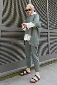 Lamelif Balance Armalı Çımalı İkili Tesettür Takım Haki