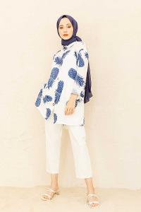 Modalamelif Ananas Basklı Gömlek Saks Mavisi